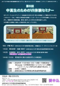 このセミナーでは、中高生の参加者の皆様にインターネット上でVRを体験してもらいながら、情報科学の最新技術、理系に進学した大学生の日常を紹介します。