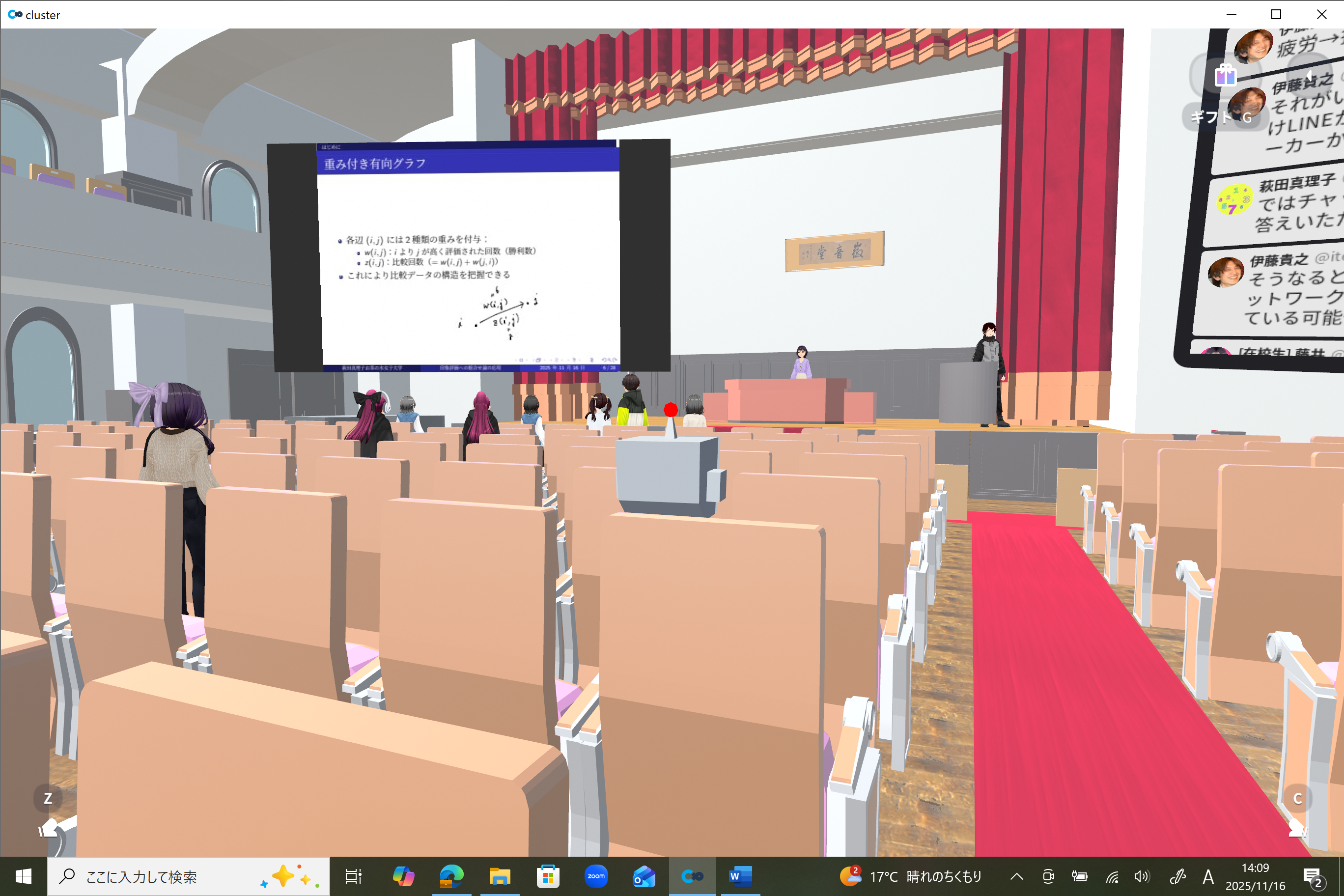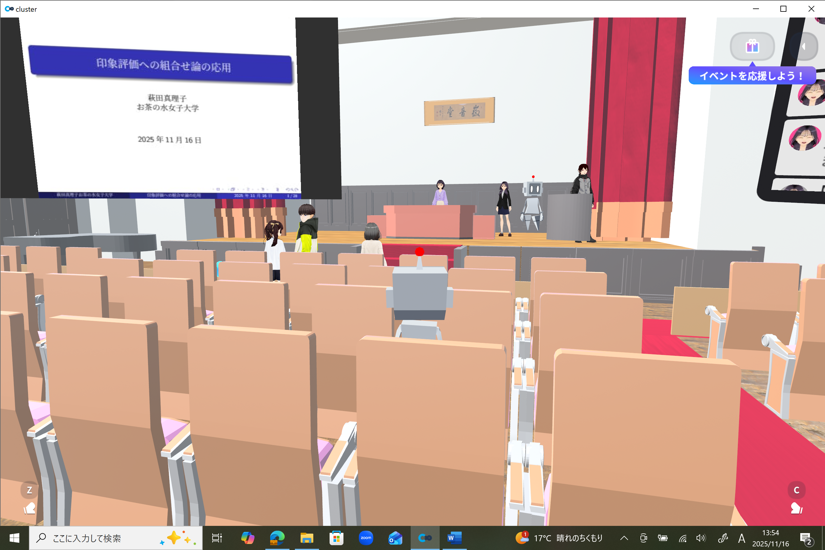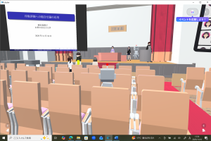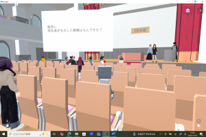 参加者は事前に送付したマニュアルにしたがってVR専用のSNS 「cluster」をインストールし、お茶の水女子大学の講堂「徽音堂」を模したVR空間で自分のアバターを操作して参加しました。実際に講堂での講演のように登壇者は壇上に上がり、壇上の両側のスクリーンに映像やスライド、コメントを映し出しました。参加者はアバターで徽音堂の中や周囲を歩き回り、リアクションをしてVR空間や講演を楽しみました。セミナーの最後には、参加者全員で徽音堂から屋外に出て、実際のお茶の水女子大学の雰囲気をより身近に感じていただきました。