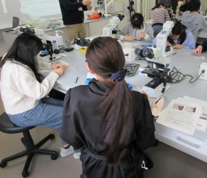 次に岩崎先生から、顕微鏡を使った切片の観察について学びました。観察の前には、1人1台用意された光学顕微鏡を使って、各部品の名前や使い方をしっかり確認しました。