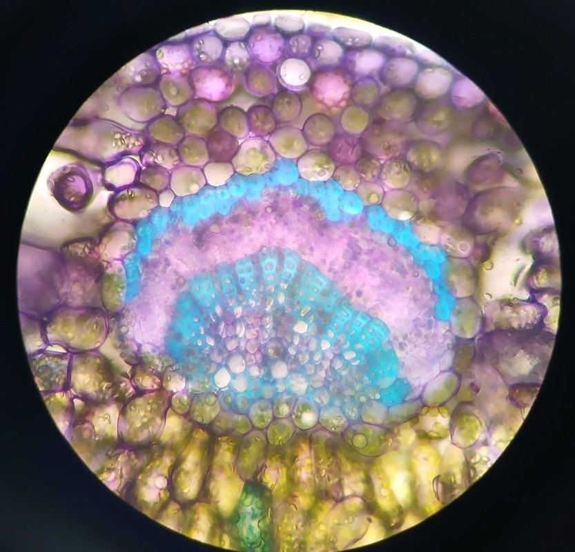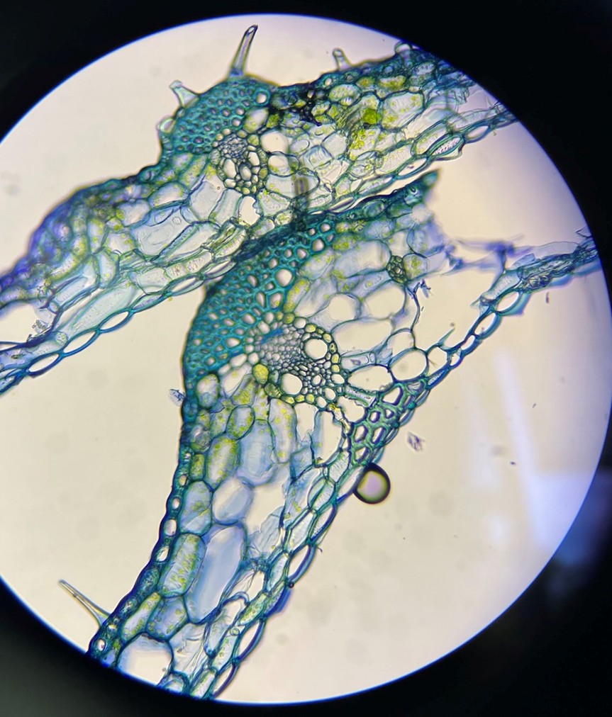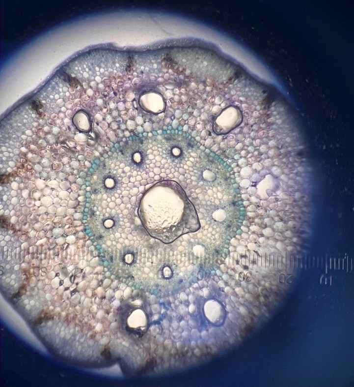 その後、今回はプラントミクロトームで作成したヤブツバキ、トウモロコシ、スギナの切片を観察しました。切片をトルイジンブルーで染色することで、葉の中のさまざまな構造が見えやすくなり、それぞれの植物がどのような特徴をもっているのかを考えました。